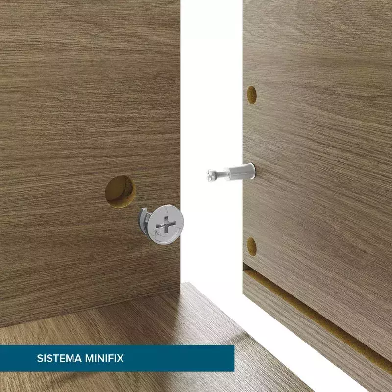 Produzido 100% em MDF de 15 mm, o New Paranoá alia resistência e durabilidade. Suas 4 portas de giro contam com puxadores no mesmo material e cor da estrutura, realçando a harmonia do design. Internamente, o guarda-roupa apresenta duas gavetas com frentes usinadas e corrediças telescópicas, cabideiros metálicos, maleiros e espaço dedicado para calçados, garantindo praticidade no dia a dia. O móvel é sustentado por seis pés, que além de contribuírem para a estética, facilitam a limpeza do ambiente. Outro diferencial importante é sua fabricação sustentável, utilizando matéria-prima de reflorestamento.